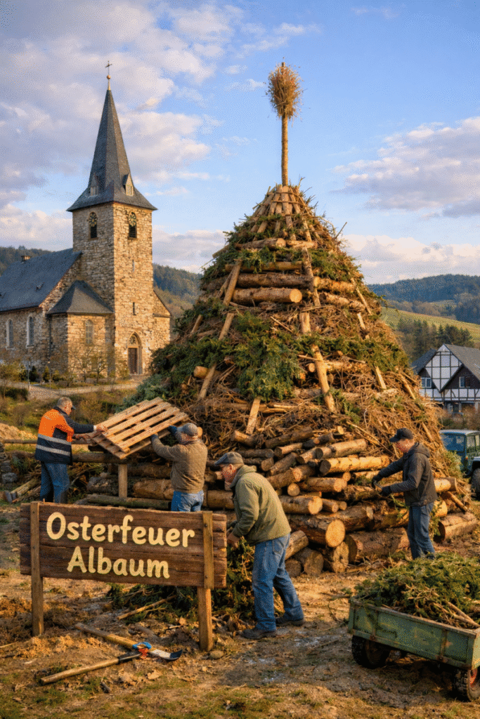 Die Osterfeuer-Bauer starten den Aufbau des Osterfeuers. Helfer sind herzlich willkommen!