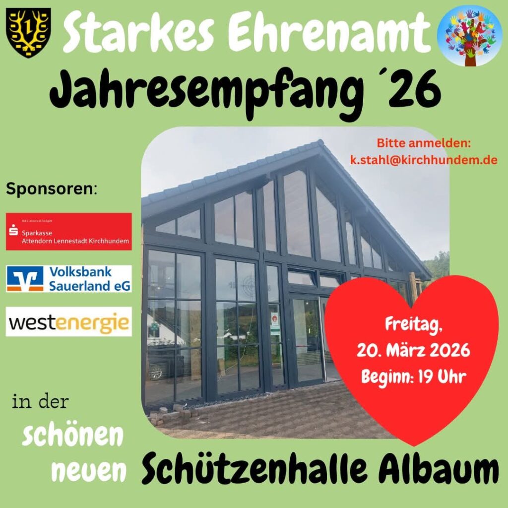 Natürlich wird es auch im nächsten Jahr einen Jahresempfang für alle Ehrenamtlichen aus Kirchhundem geben: Freitag, 20. März 2026 um 19 Uhr in der frisch sanierten und liebevoll renovierten Schützenhalle Albaum.